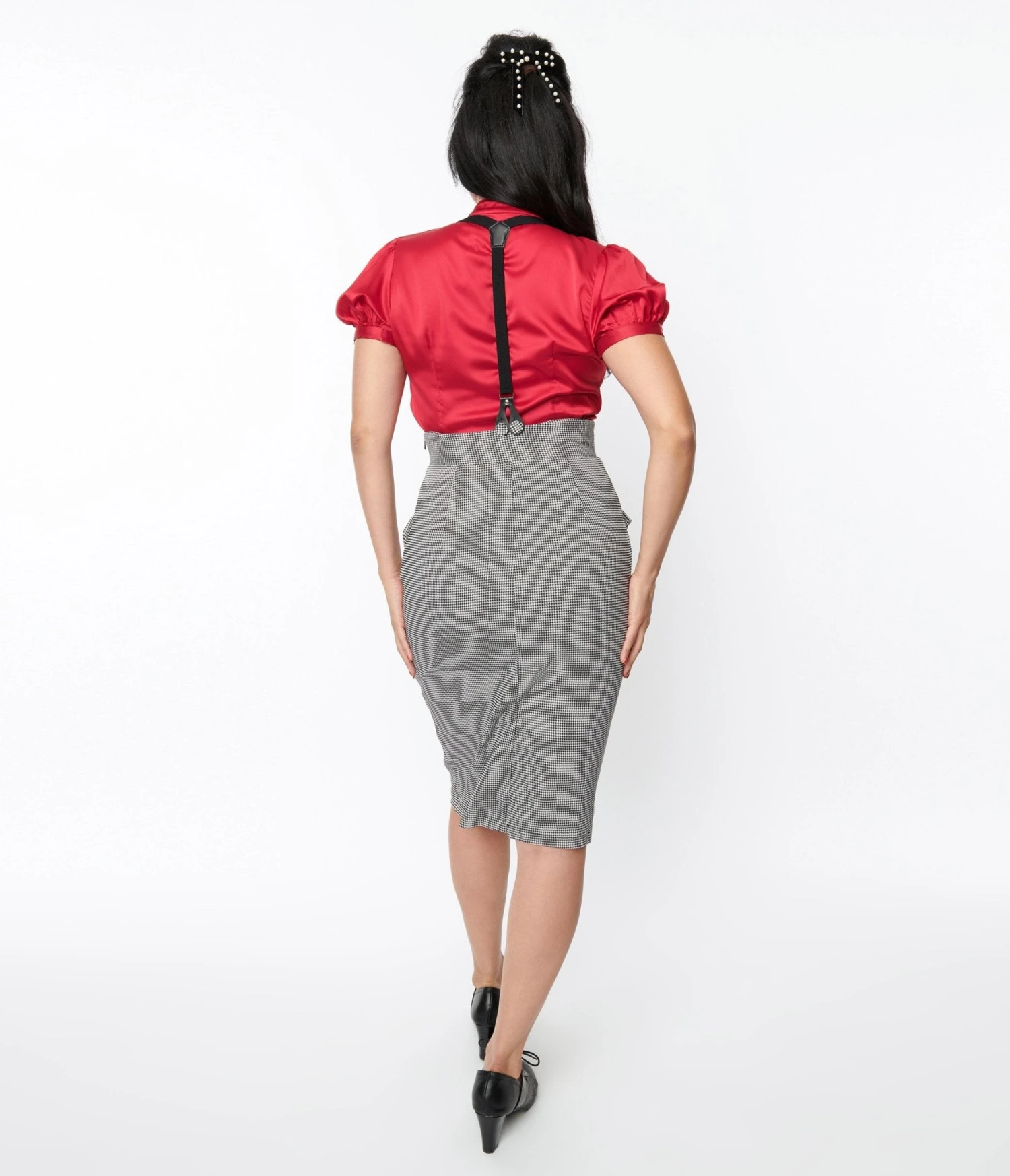 This darling 1950s style wiggle skirt is designed to hug your curves in all the right places, thanks to its black and white houndstooth stretch woven material. With playful suspenders, side pockets adorned with charming attached bows, and a convenient side zipper for easy wear, this skirt just screams chic and sassy!