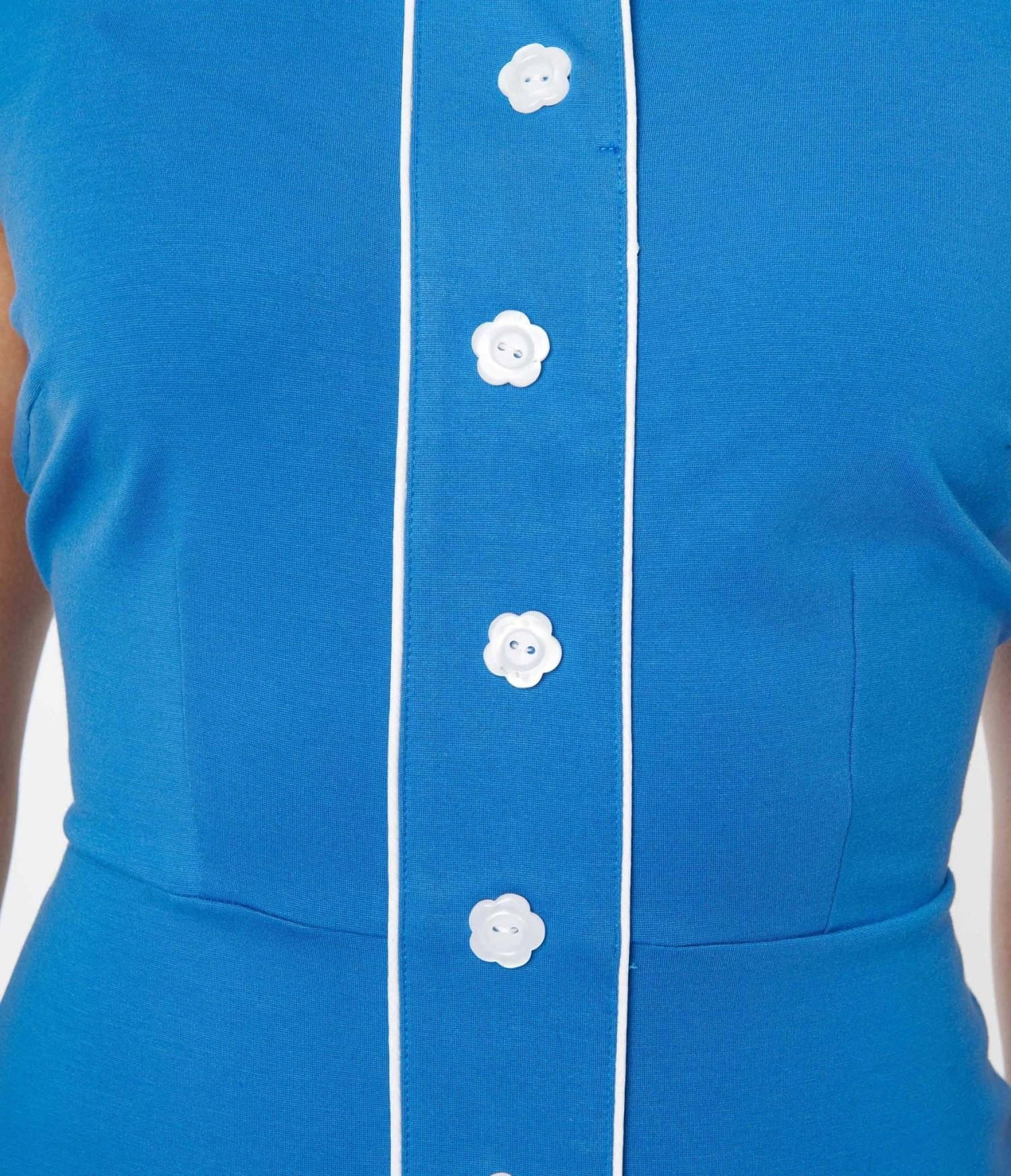 This gorgeous 1960s inspired bodycon dress is set in a blue stretch woven with white piping. Outfitted with a peter pan collar and adorable white floral faux buttons. Complete with front pockets.
