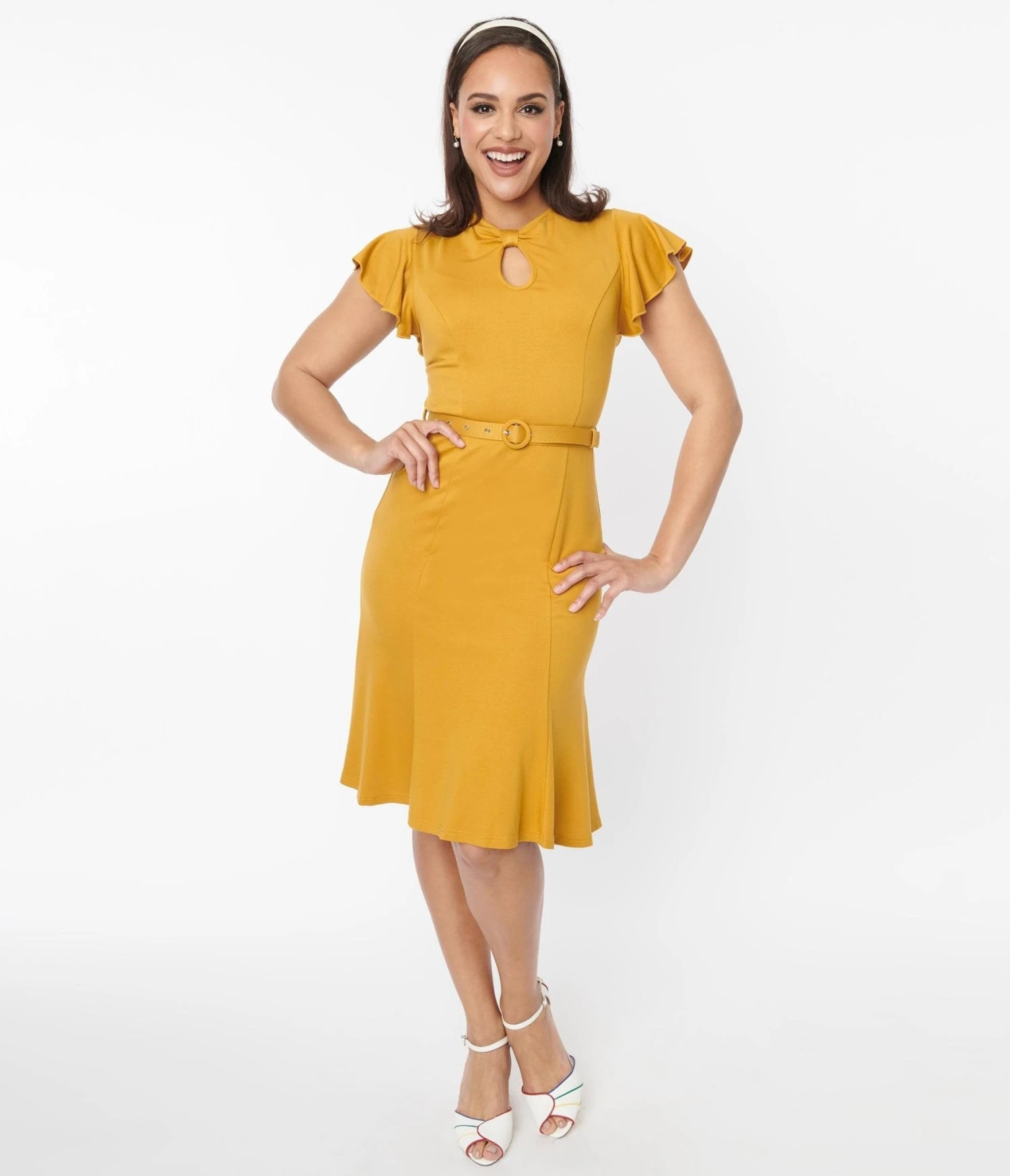 This 1940s style fit and flare dress from Voodoo Vixen is a must-have staple for any wardrobe! Crafted in a soft mustard knit fabric that features a scoop neckline adorned with a keyhole and fun flutter sleeves. Complete with side pockets, back zipper, and faux front buttons. Complete with a back zipper and belt to accentuate your waist!