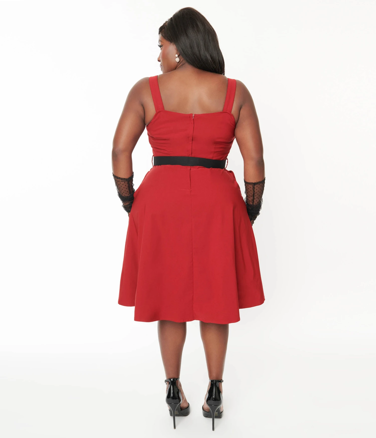 This stunning 1950s red colored dress is perfect for any occasion, whether it’s a night out or a special event. The black heart shaped belt buckle adds an extra touch of charm and style that will make you feel like the ultimate fashionista. With its sleeveless design, sweetheart neckline, and faux heart shaped buttons, this dress offers both comfort and elegance. Plus, it features convenient side pockets to keep your essentials close at hand. Getting dressed has never been easier thanks to the back zipper closure.