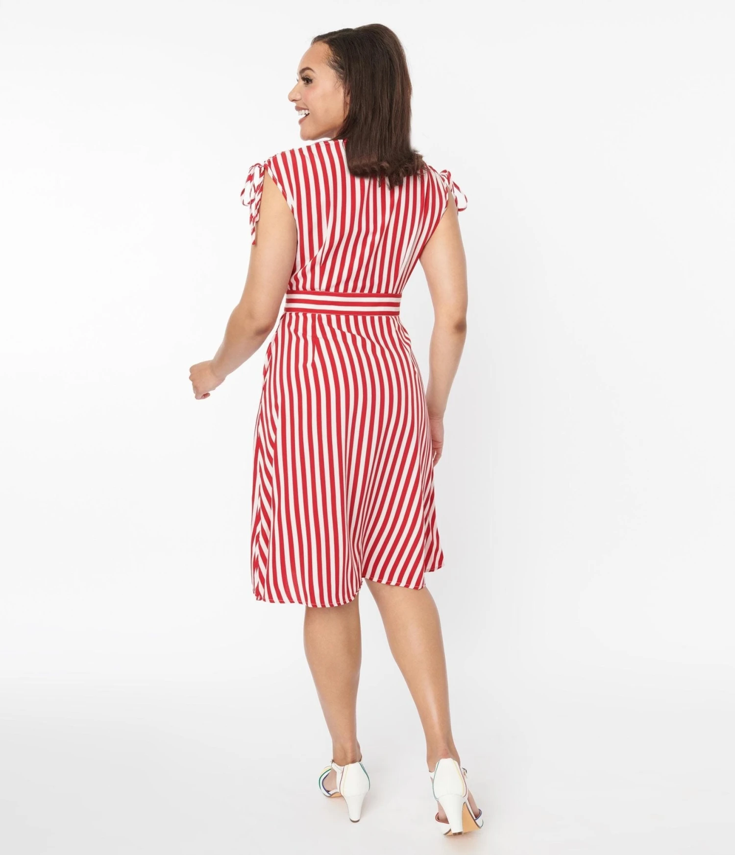 This charming 1940s style fit and flare dress from Voodoo Vixen is set in a woven boasting red and white vertical stripes throughout. Outfitted with a surplice V neckline, self-tie short sleeves, and button down front. Complete with side pockets.