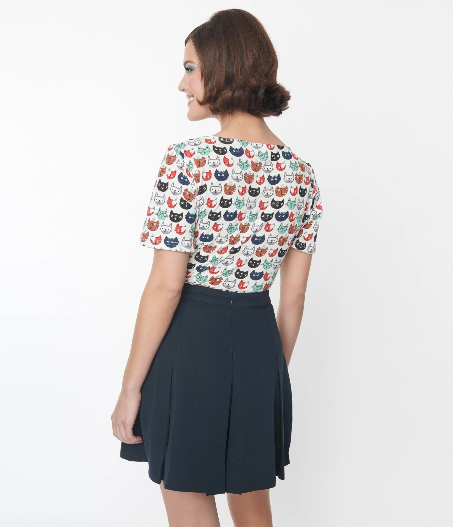 This adorable top is crafted in a soft white knit with blue trim and multicolored cats throughout. The v-neckline leads to a partial button down front and is anchored by short sleeves.