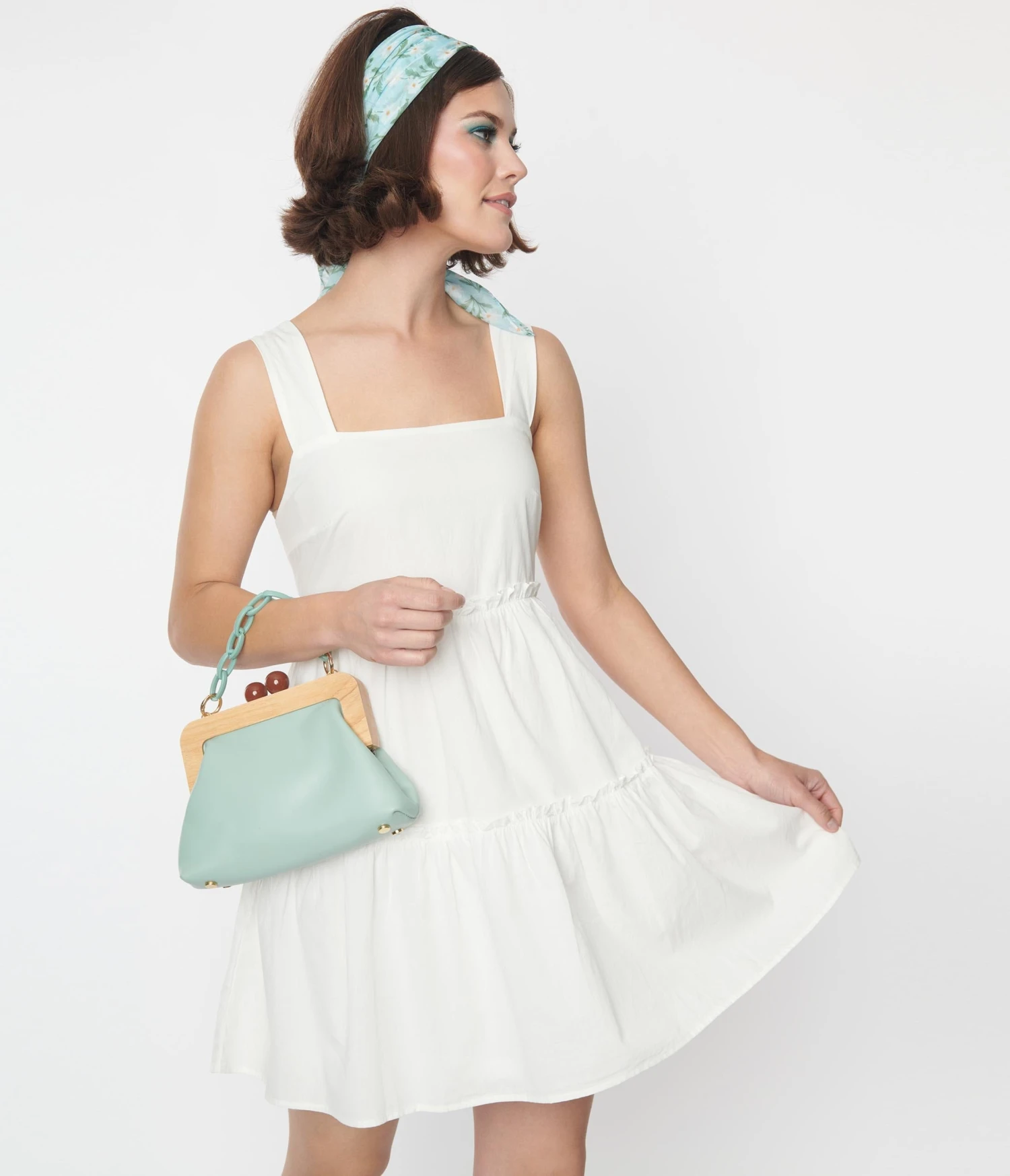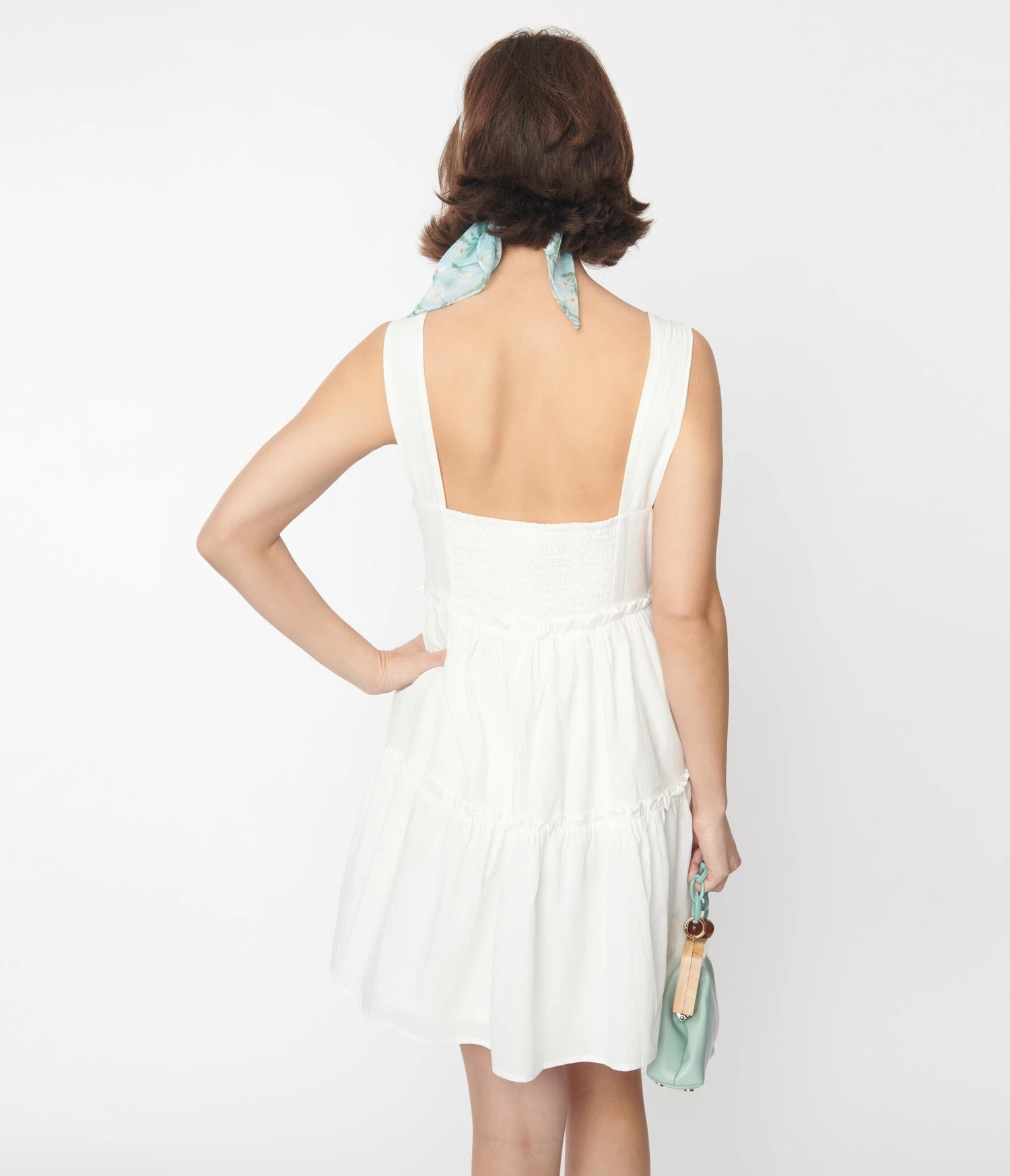 This adorable mini A-Line dress is crafted in a lovely lightweight white woven. Outfitted with a smocked back and square neckline.