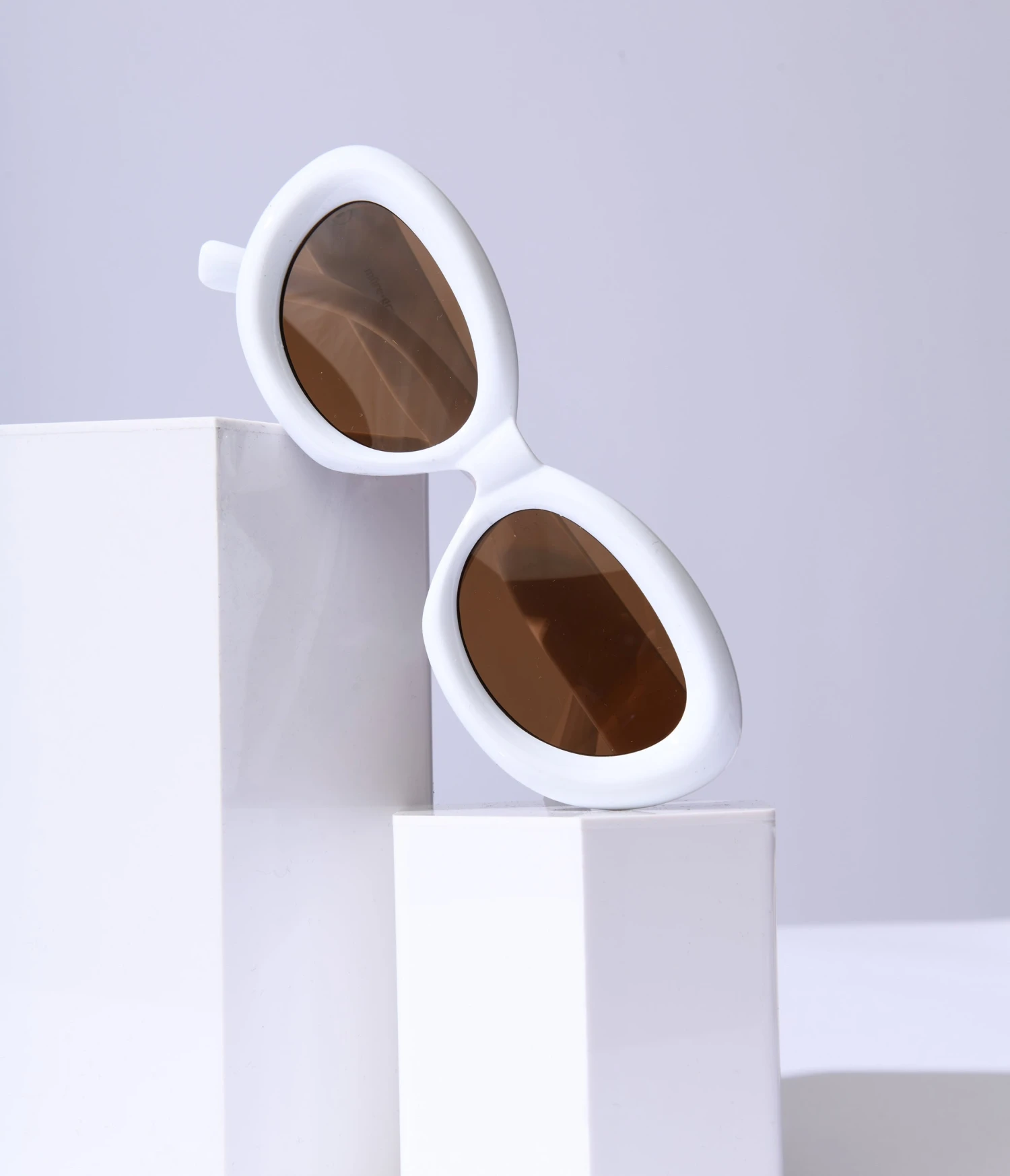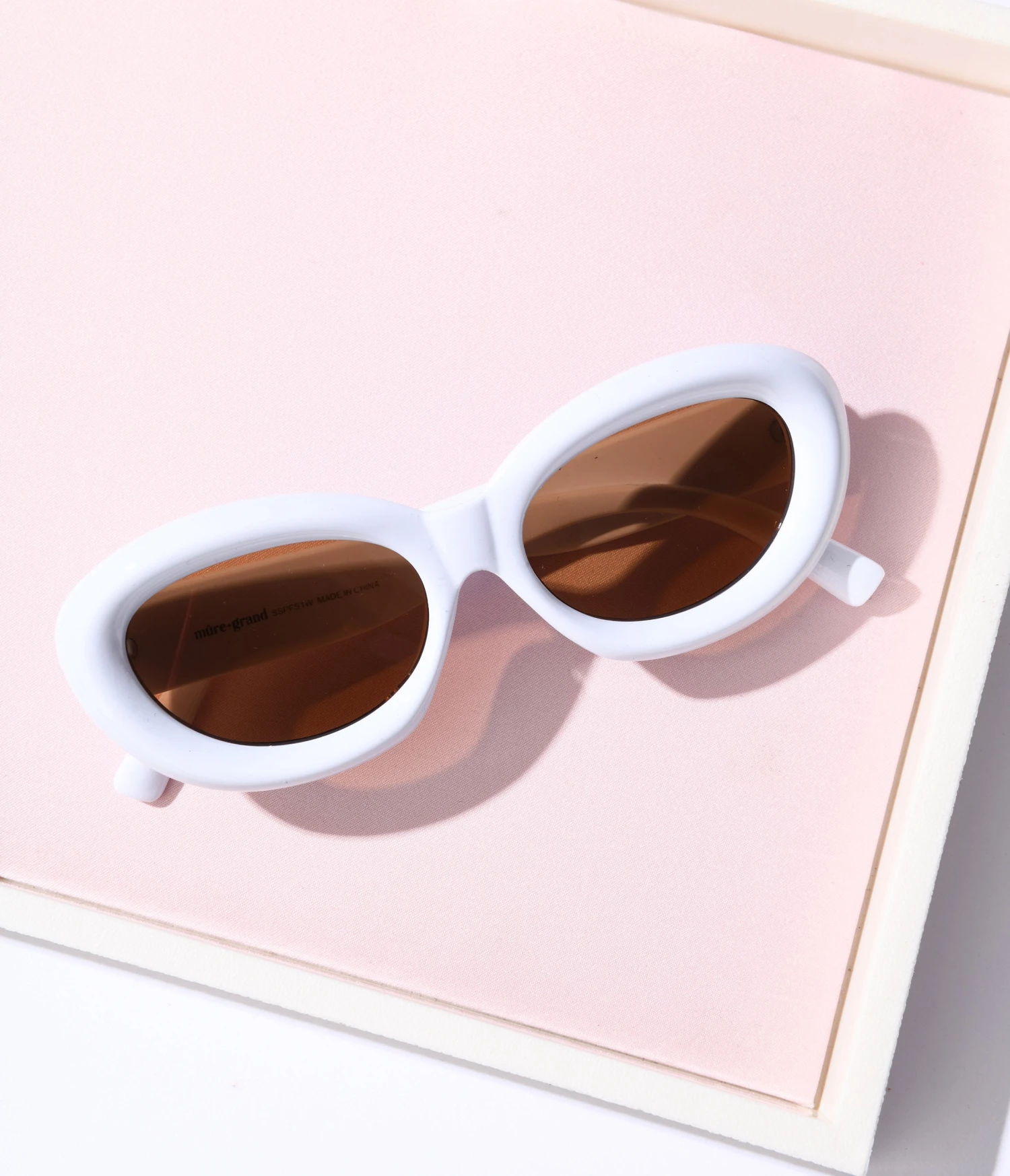 White oval shaped sunglasses with a puffy frame. Complete with molded nose and curved arms.